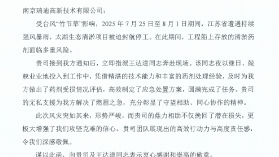 • 南京瑞迪高新技術(shù)有限公司緊急馳援中交天航局太湖項目部 08-21